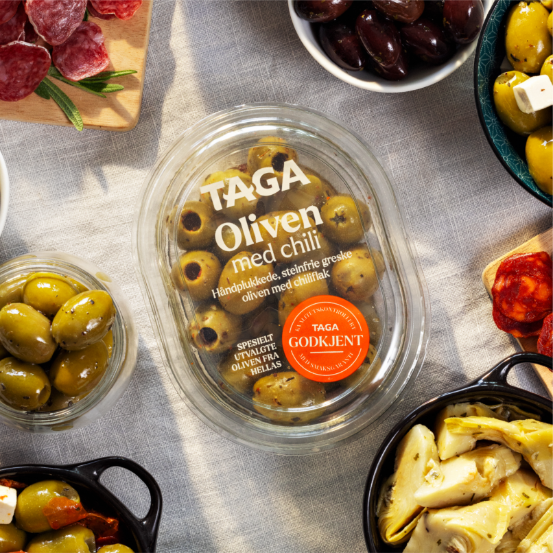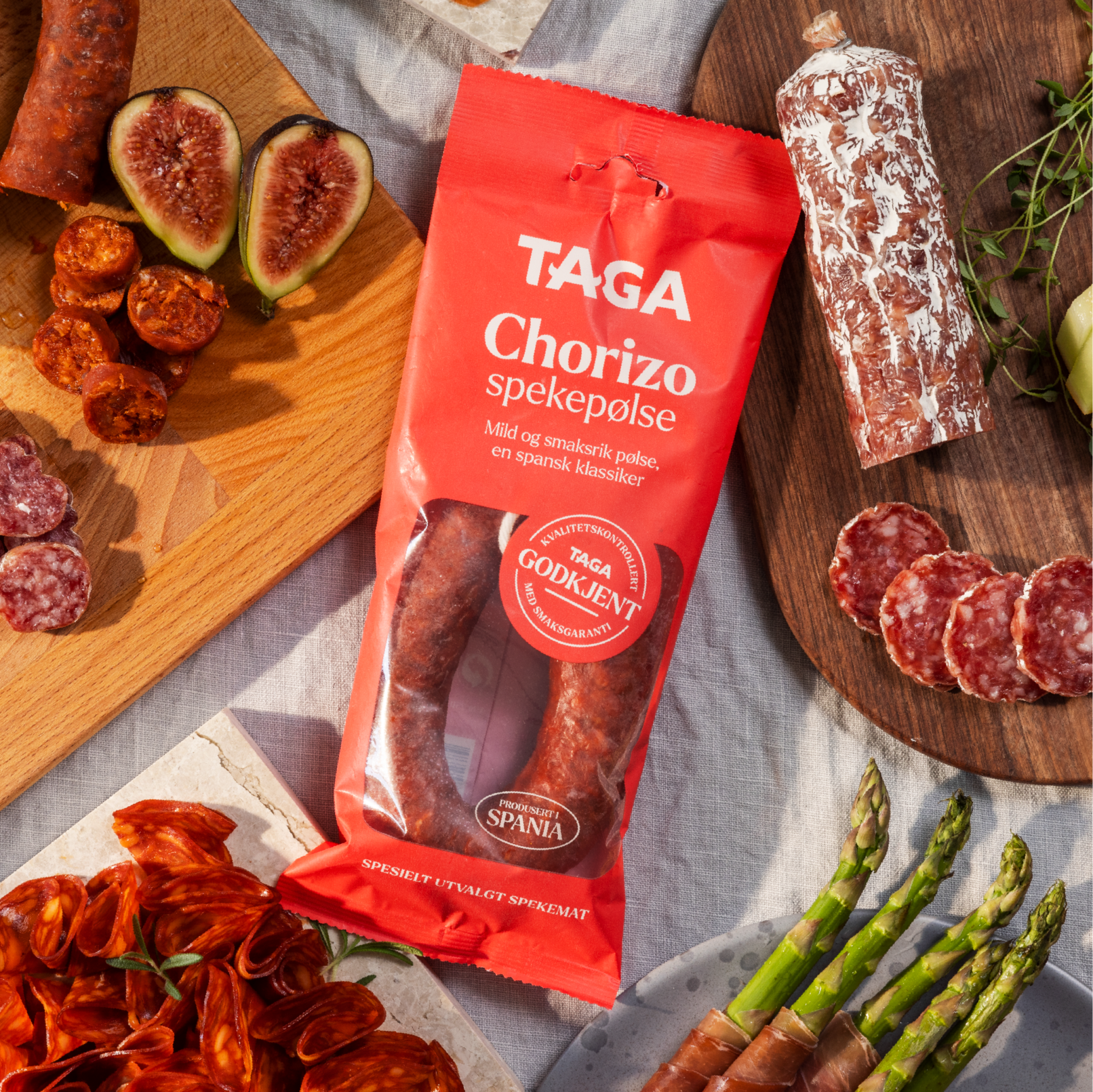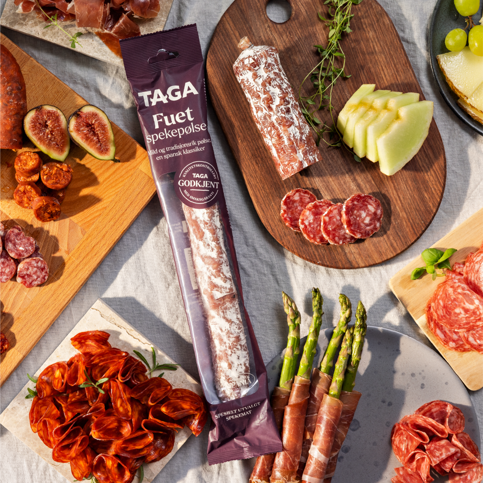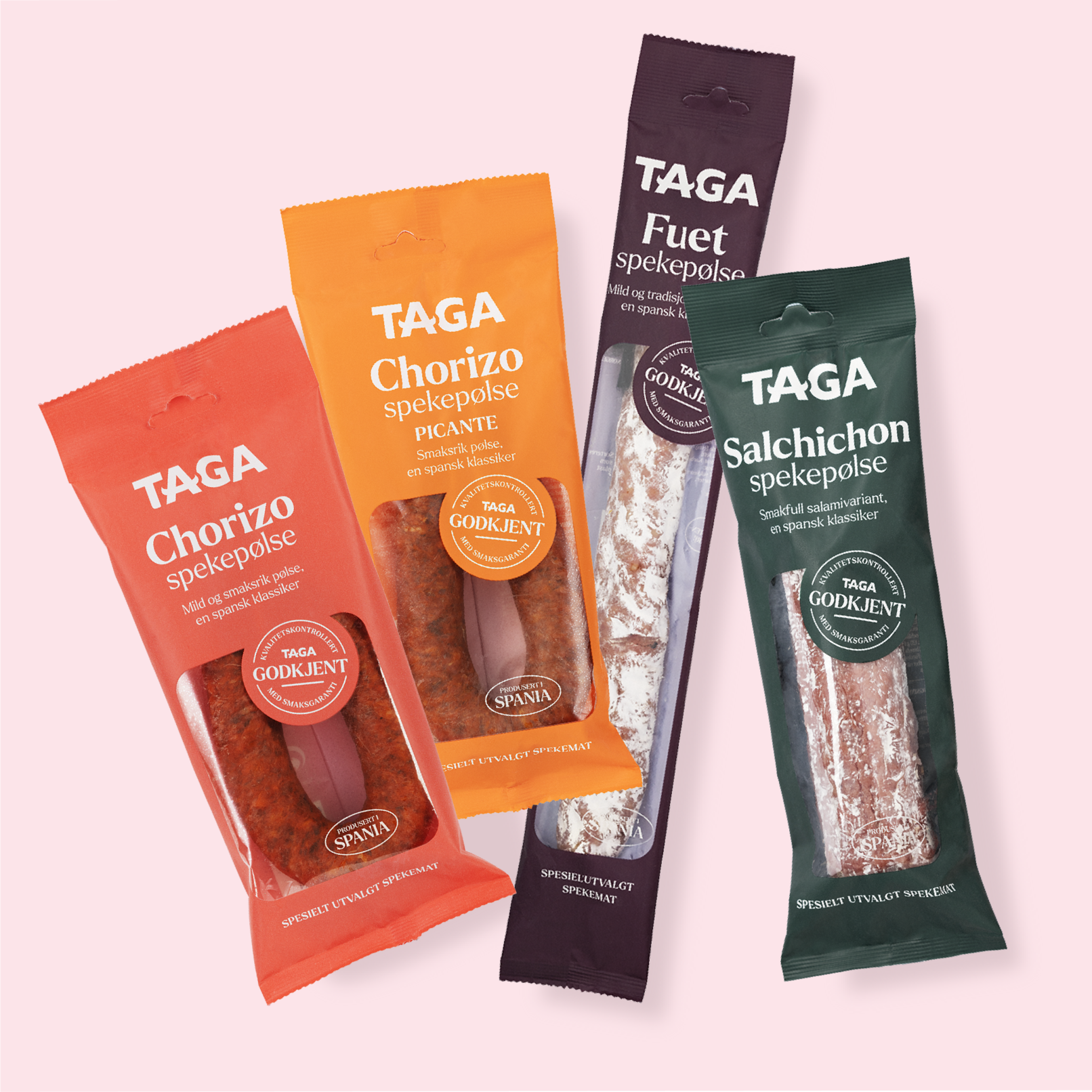 Taga jobber med spekemat og tapasprodukter fra basen sin i Trondheim, med følere ute til ulike matprodusenter rundt middelhavet. Det var en god porsjon eventyrlyst og kjærlighet til gode matopplevelser som fikk dem inn i bransjen i 1994. På få år har Taga arbeidet seg opp til å bli en betydelig leverandør av spekeprodukter til det norske markedet. Og ikke minst, markert seg med sans for smak og kvalitet. Vi i Bardus Design har jobbet med Taga i mange år, og har nå redesignet deres basic serie med spansk spekemat.